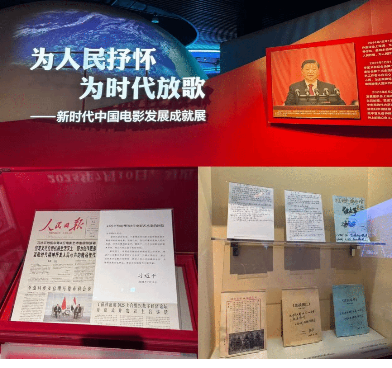 同学们循着展陈脉络、在讲解员的细致引导下,重点参观了“为人民抒怀 为时代放歌——新时代中国电影发展成就展”。在展览现场,公开展出的重磅藏品让大家驻足良久、深深动容:陈凯歌导演《志愿军》系列的文字分镜头手稿,字迹间凝结着对志愿军战士的敬畏与诠释;张艺谋导演签名的《狙击手》剧本,见证着以小切口展现大格局的创作匠心;从聚焦脱贫攻坚的《山海情》到展现科技自立自强的《中国医生》,从诠释家国情怀的《长津湖》系列到彰显法治精神的《底线》,一部部力作紧扣时代脉搏,无不感受着新时代中国的发展巨变与精神风貌。