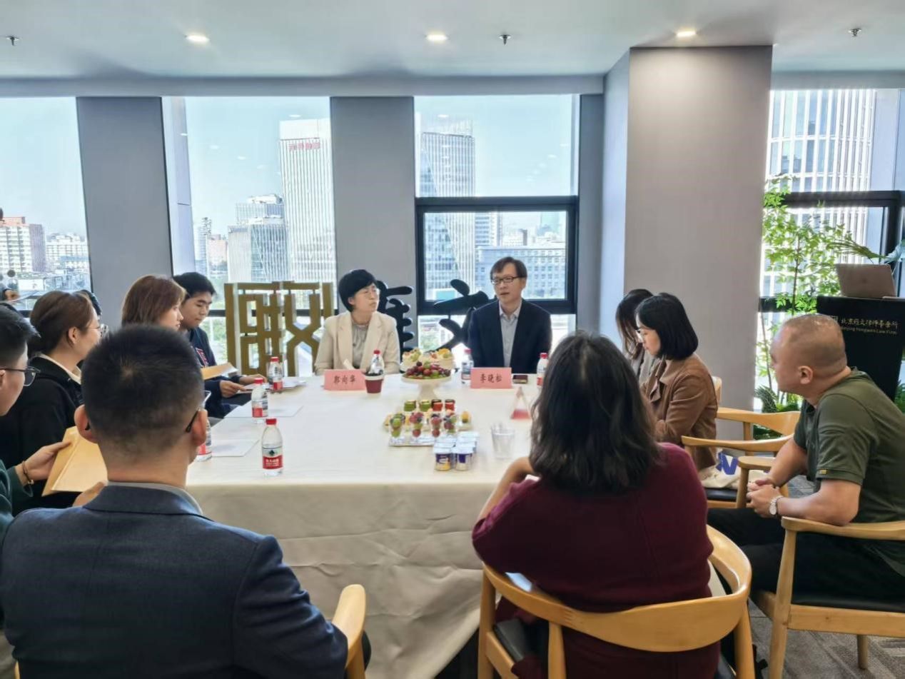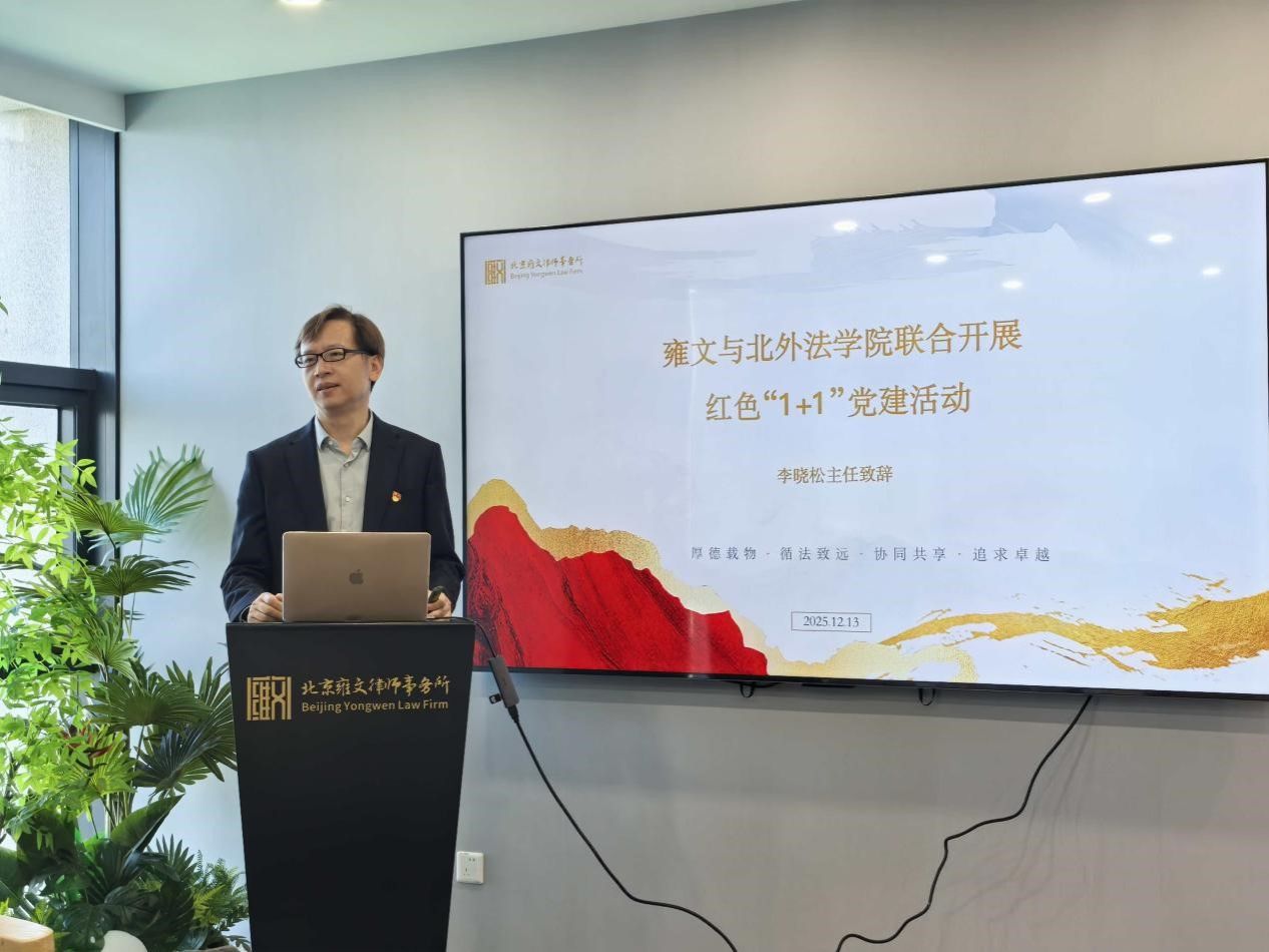 2025年10月13日,法学院法律硕士研究生党支部与北京雍文律师事务所在雍文北京办公室联合举办红色“1+1”共建活动。法学院党总支书记郭向华、团总支书记刘时剑率学生党员及积极分子代表参加活动,雍文所主任、党支部书记李晓松律师,党支部副书记李宾律师、宣传委员刘达律师与雍文高科技法律团队柴琳琳律师、易吉灵律师,医嘉易医药大健康团队刘伟律师、张东庐律师,争议解决团队张传雷律师热情接待了法学院师生。活动由北外英语学院校友、雍文战略总监韩焕霞主持。