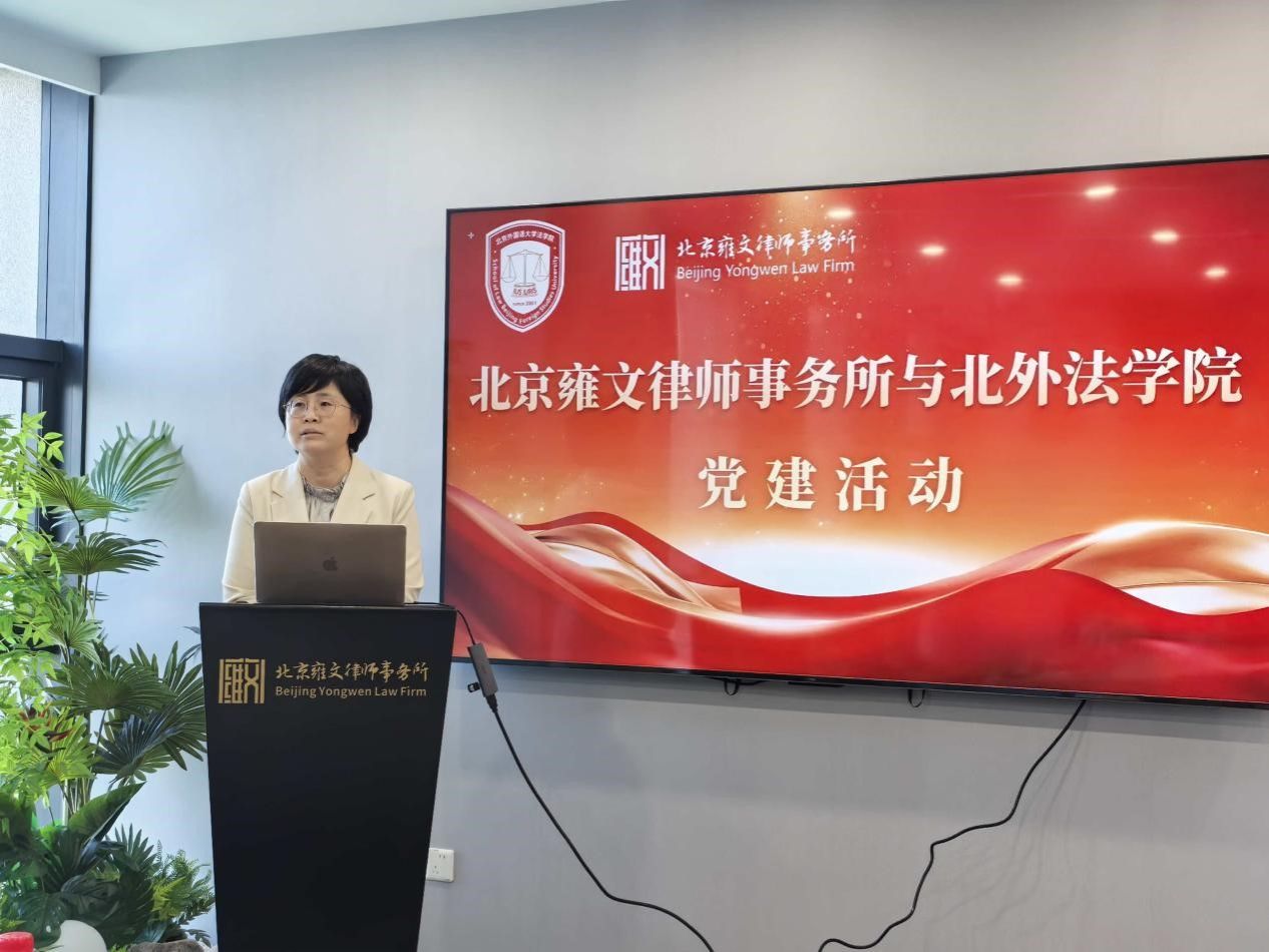 郭向华书记随后绍了北外法学院的基本情况。作为我国首批涉外法律人才培养基地和国家一流本科专业建设点,法学院依托北外在语言教学方面的独特优势,致力于培养具有家国情怀、全球视野、专业本领的复合型涉外法治人才。她表示,本次红色“1+1”活动,不仅是对学校党建工作部署的积极响应,也是基层党建工作创新的一次有益尝试,更是在法治人才培养中贯彻“实践育人”理念的重要举措。她期望通过校所合作,构建协同育人平台,使学生能够走出课堂,拓宽视野,在实际工作中提升自身的专业技能。