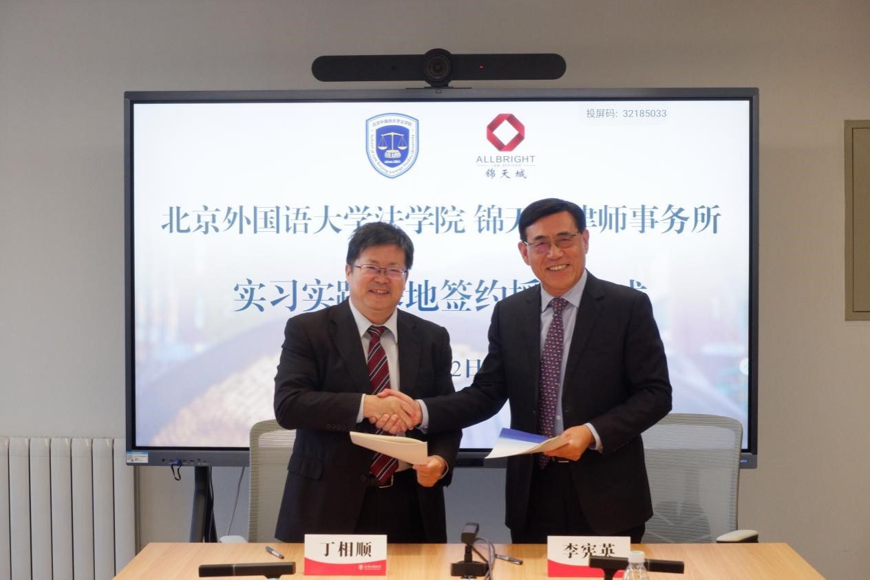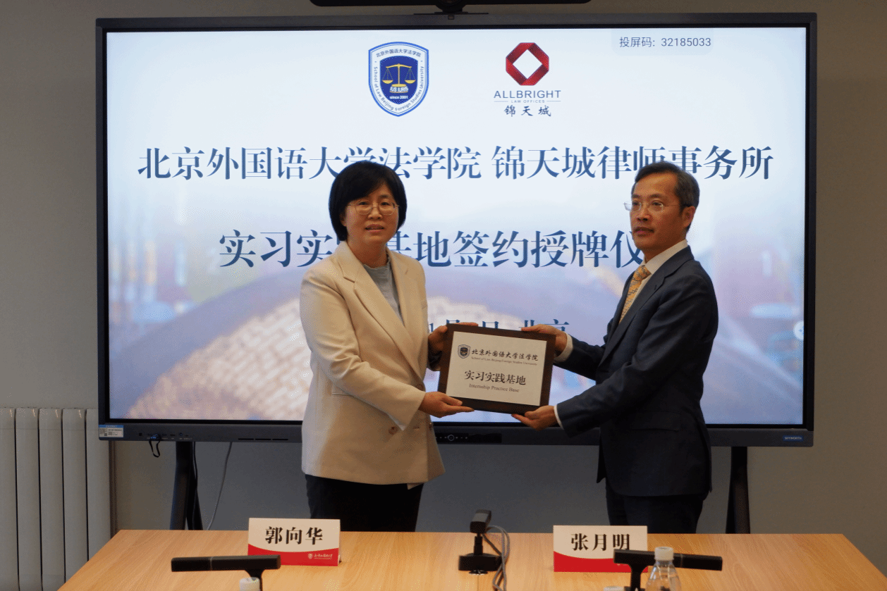 11月2日下午,北京外国语大学法学院与锦天城律师事务所实习实践基地签约暨揭牌仪式在北外法学院顺利举行。北京外国语大学法学院党总支书记郭向华,院长丁相顺教授,团总支书记刘时剑;锦天城律师事务所党委副书记、高级合伙人李宪英律师,锦天城(北京)律师事务所主任、高级合伙人张月明律师,锦天城律师事务所高级合伙人李宪明律师,以及锦天城(北京)律师事务所合伙人梁光勇律师、颜廷冉律师出席签约仪式。