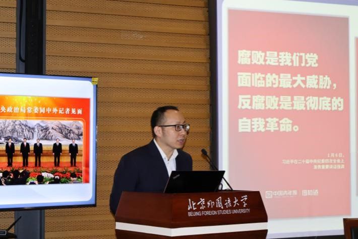 2025年11月19日下午,最高人民检察院“检察实务专家进校园”系列活动第八讲在北京外国语大学图书馆五层成功举办。本次讲座由天津市人民检察院第一分院第三检察部副主任、四级高级检察官、法学博士刘文钊主讲,主题为“当前职务犯罪疑难问题分析”。讲座由北外法学院院长丁相顺教授主持。