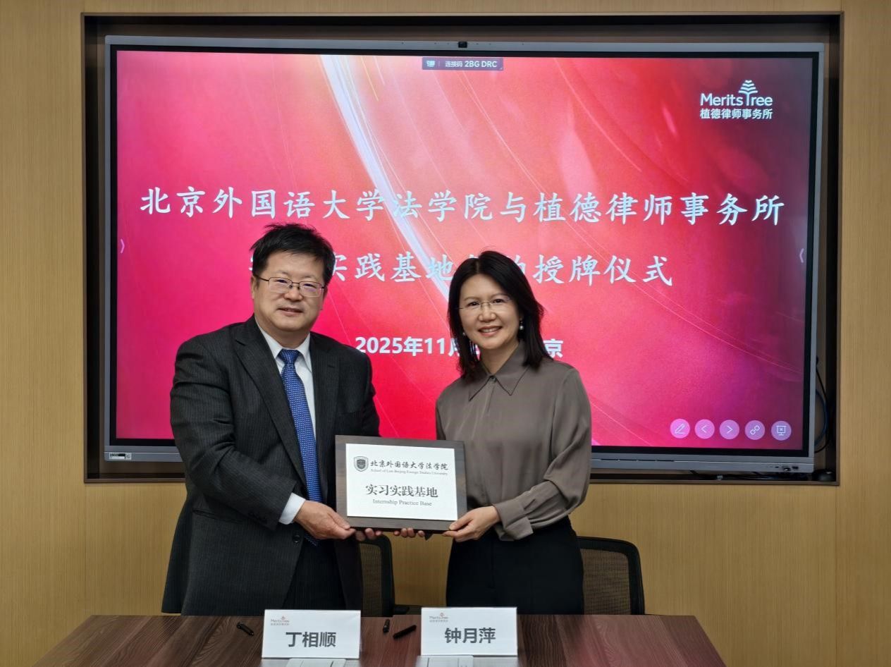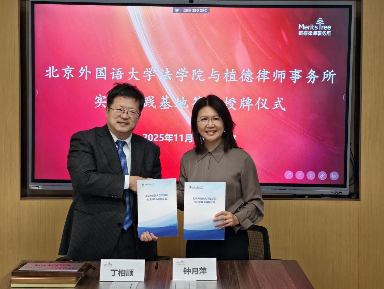仪式现场,丁相顺院长与钟月萍律师共同签署合作协议,并为“北京外国语大学法学院实习实践基地”揭牌。双方围绕明年法学院建院 20周年之际举办学术活动、畅通学生实习实践渠道、推进数字化法治人才培养等方面的合作,展开深入交流并达成共识。