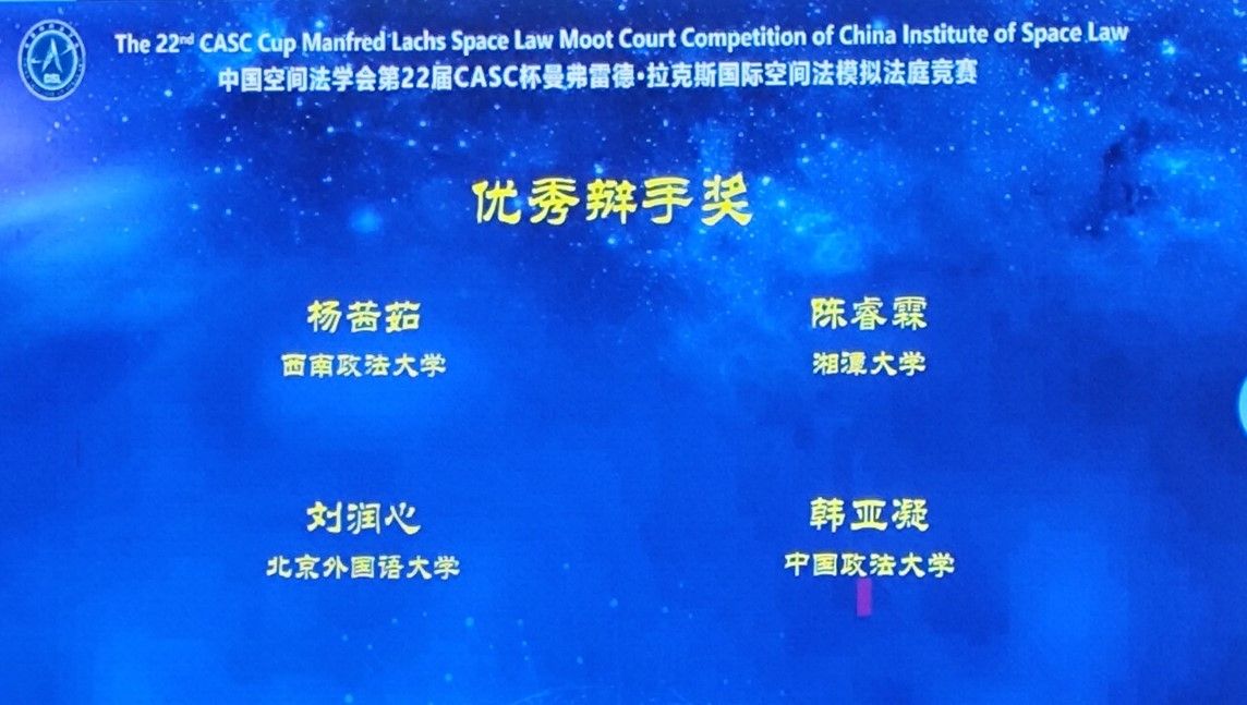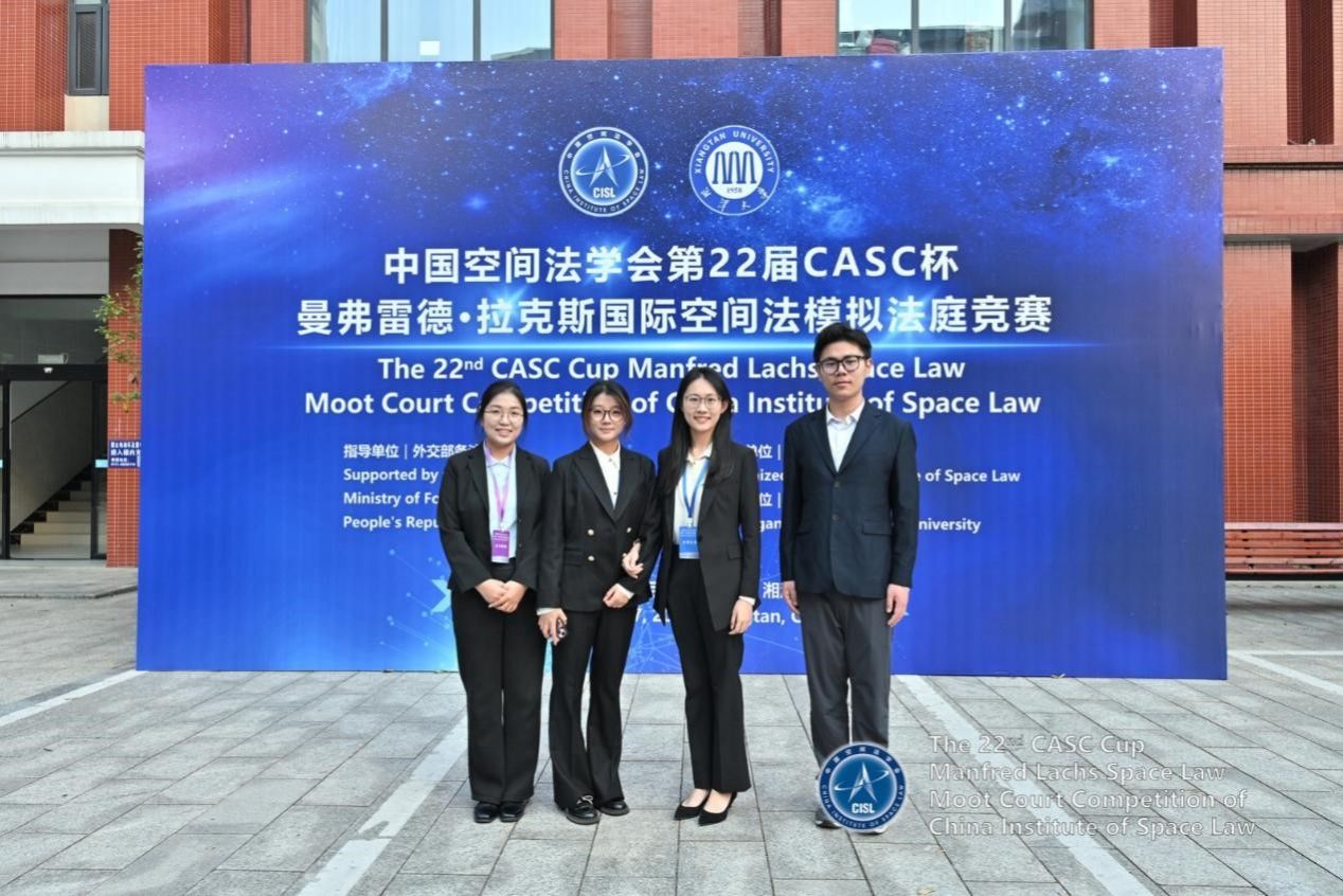 2025年12月5日-12月7日,中国空间法学会第22届CASC杯曼弗雷德·拉克斯国际空间法模拟法庭竞赛在湘潭大学举办,北京外国语大学代表队在法学院教师付姝菊和2024级研究生张健的指导下荣获全国三等奖,口辩员刘润心获得“优秀辩手”称号。