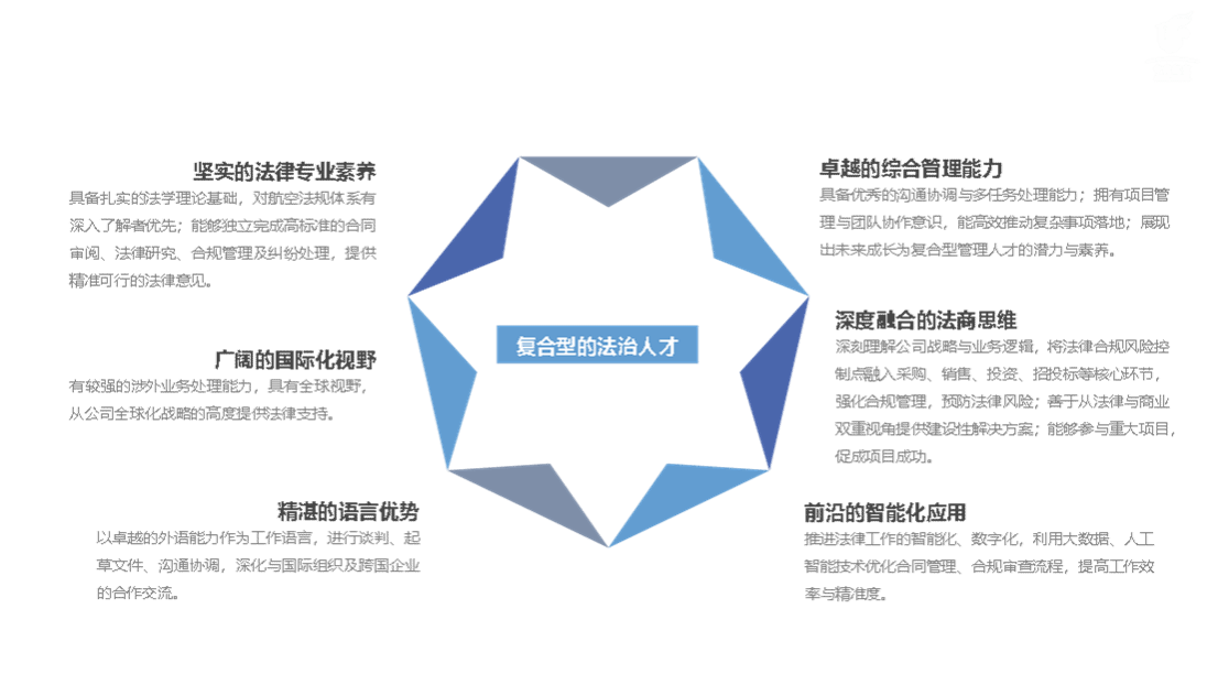 在谈到央企法律部所需人才时,吕总强调了复合型法治人才的重要性。她提到,现代法治人才不仅需要扎实的法律专业素养,能够处理复杂的法律事务,还要具备广阔的国际视野和流利的语言能力,能够应对全球化背景下的法律挑战。此外,具备法商思维,能够在重大决策中提供有价值的法律支持,融合数字化技术提升法律工作的智能化,也是对人才的核心要求。同时,良好的沟通协调能力和项目管理能力,尤其在跨部门协作中的高效推进,也是现代法律人才不可或缺的能力素质。