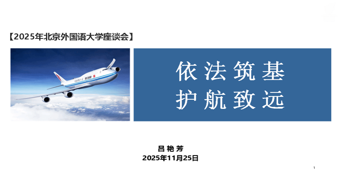 2025年11月25日,中国航空集团有限公司、中国国际航空股份有限公司法律部总经理吕艳芳应北京外国语大学法学院邀请,以“依法筑基 护航致远”为主题,与学院师生深入交流央企法治建设与航空公司法务工作实践。本次座谈会由北京外国语大学法学院副院长董念清教授主持。