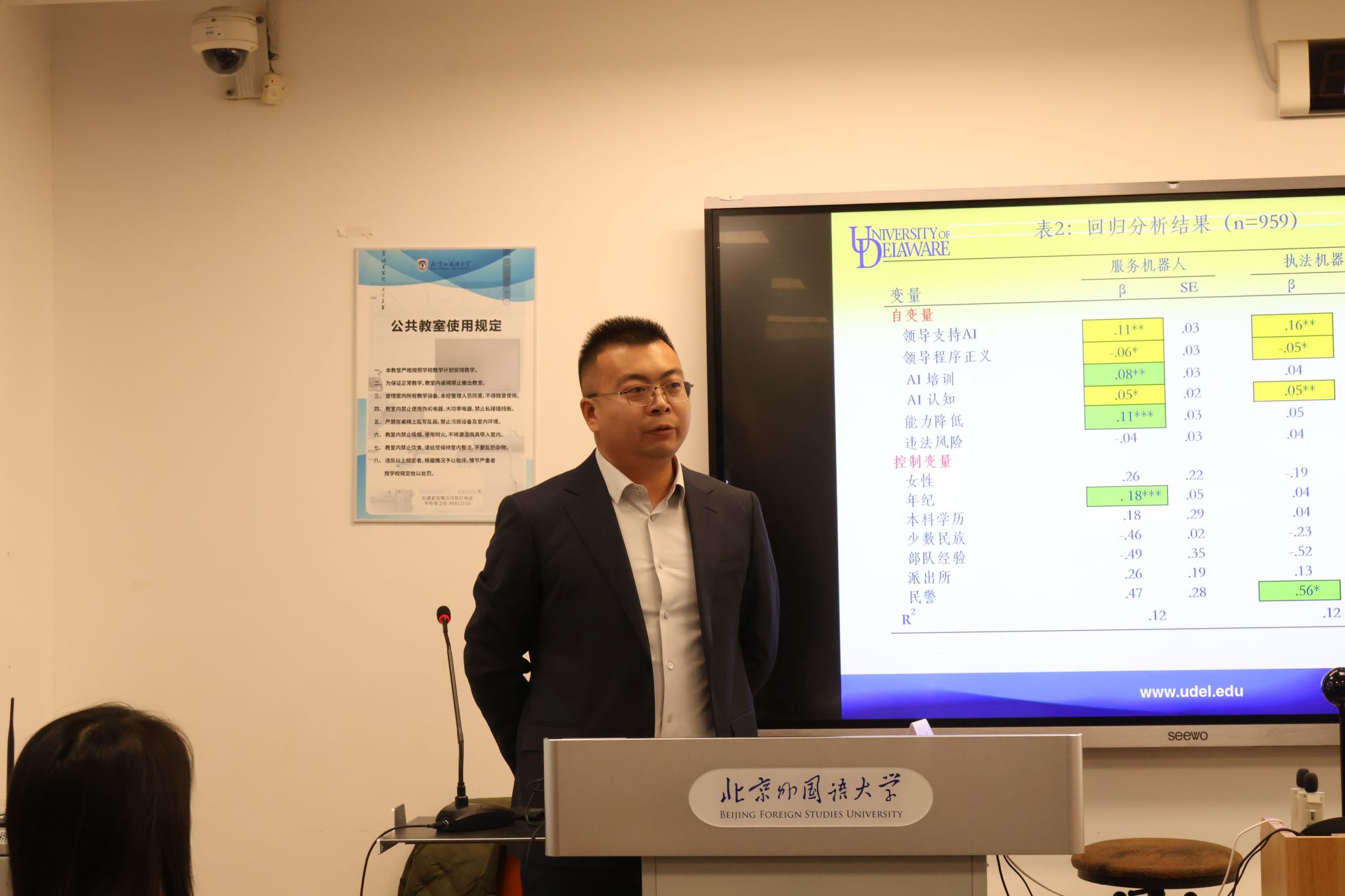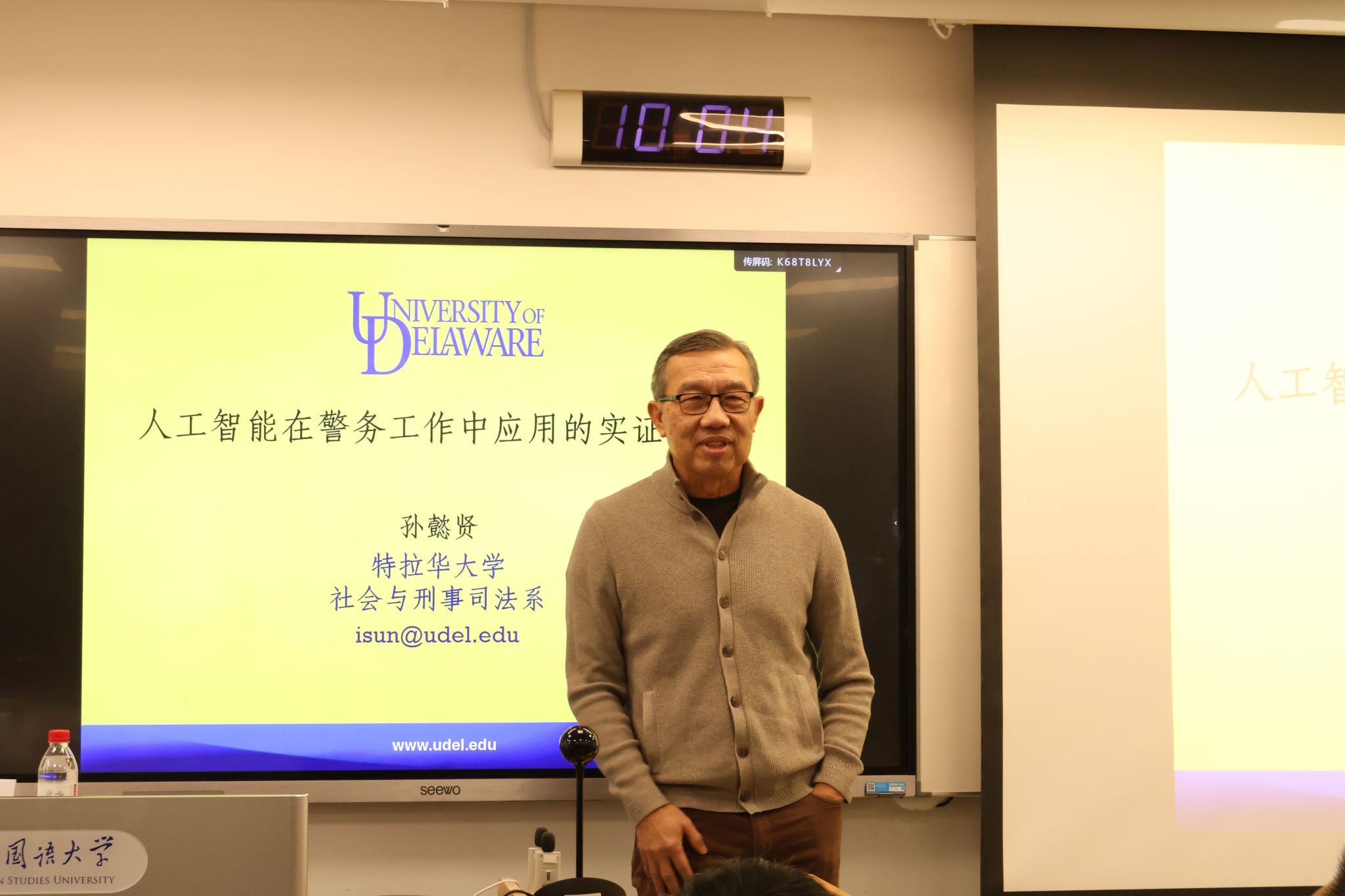 2025年12月12日上午,美国特拉华大学社会及刑事司法学系孙懿贤(Ivan Sun)教授应邀访问我院,围绕“人工智能在警务工作中应用的实证研究”发表专题演讲。本次讲座由中国政法大学刑事司法学院讲师许博洋、中伦文德律师事务所总所合伙人律师陈建担任与谈嘉宾,北外法学院讲师陈雨楠主持,院长丁相顺出席并致欢迎辞。