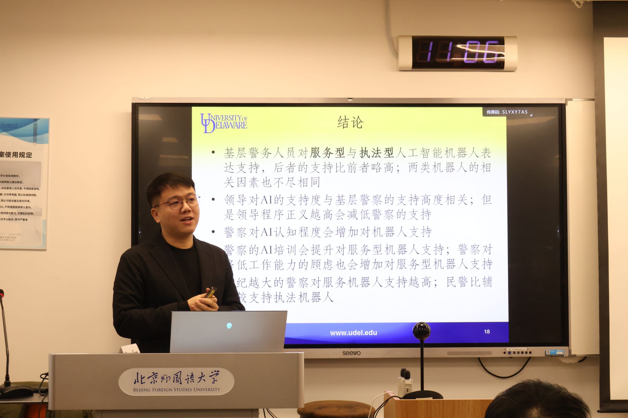 孙教授首先介绍了特拉华大学及其在刑事司法研究领域的深厚学术传统,随后以国际视野系统梳理了人工智能技术在全球警务中的应用现状与发展趋势,客观指出当前警务技术实践与科幻想象之间存在的现实差距。讲座重点聚焦于其团队开展的人工智能警务机器人接受度实证研究。该研究采用联合实验法,通过科学的问卷调查与场景模拟相结合,深入分析了影响民警对人工智能机器人采纳意愿的关键因素。研究特别设置了两种典型应用场景:一是以日常服务与信息查询为主的服务型警务机器人,二是以打击犯罪为主的执法型警务机器人。通过对比分析两类设备的实际接受度,系统探讨了人工智能技术在执法环境中的应用差异与接受机制。