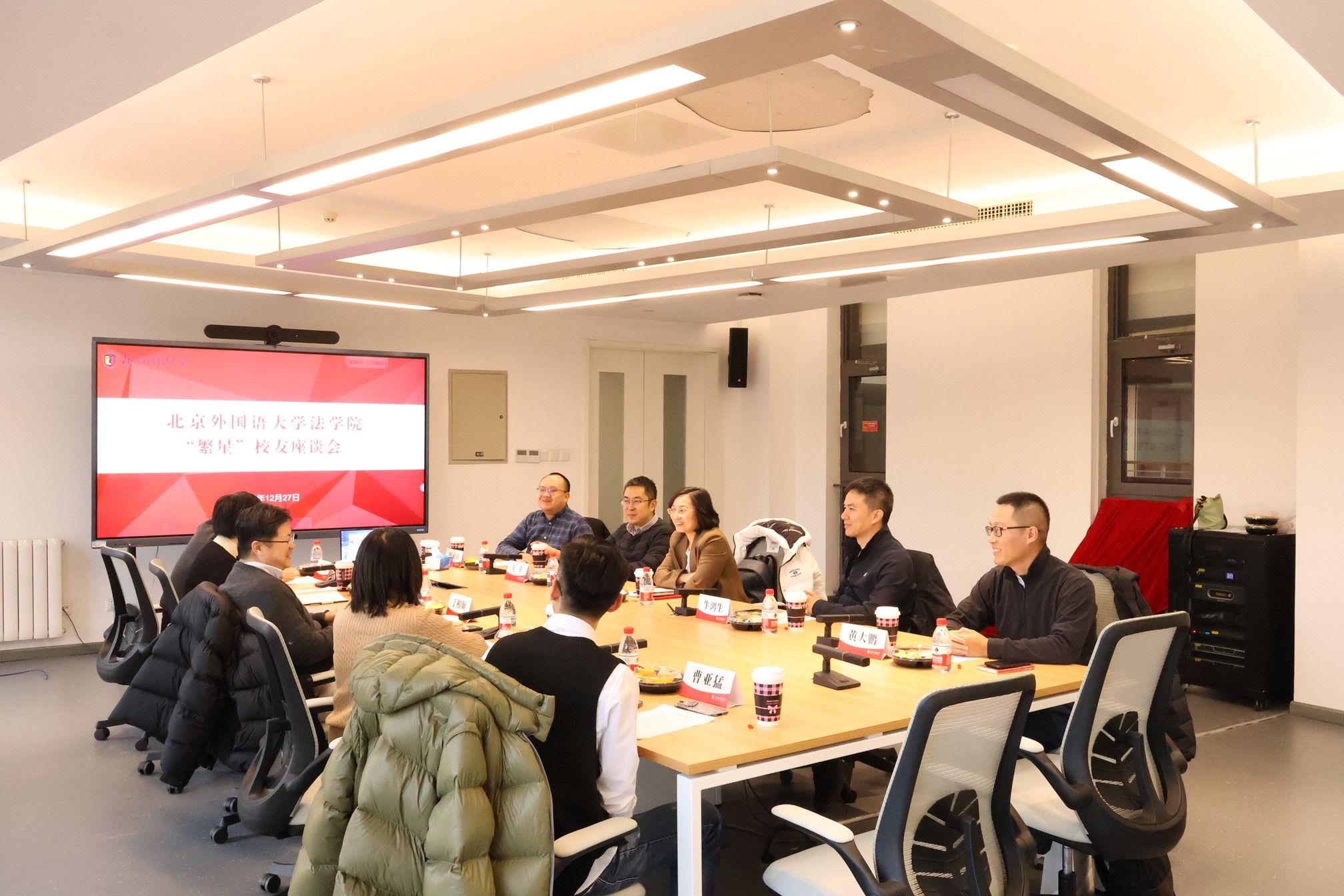 为凝聚校友力量、共商学院发展大计,喜迎北外法学学科设立25周年、法学院建院20周年,2025年12月27日下午,法学院在西校区国内大厦1号楼308会议室召开“繁星”计划校友座谈会。法学院党总支书记郭向华、院长丁相顺、团总支书记刘时剑、教务秘书李薇、部分在校生代表、及校友代表参加座谈。活动由刘时剑主持。