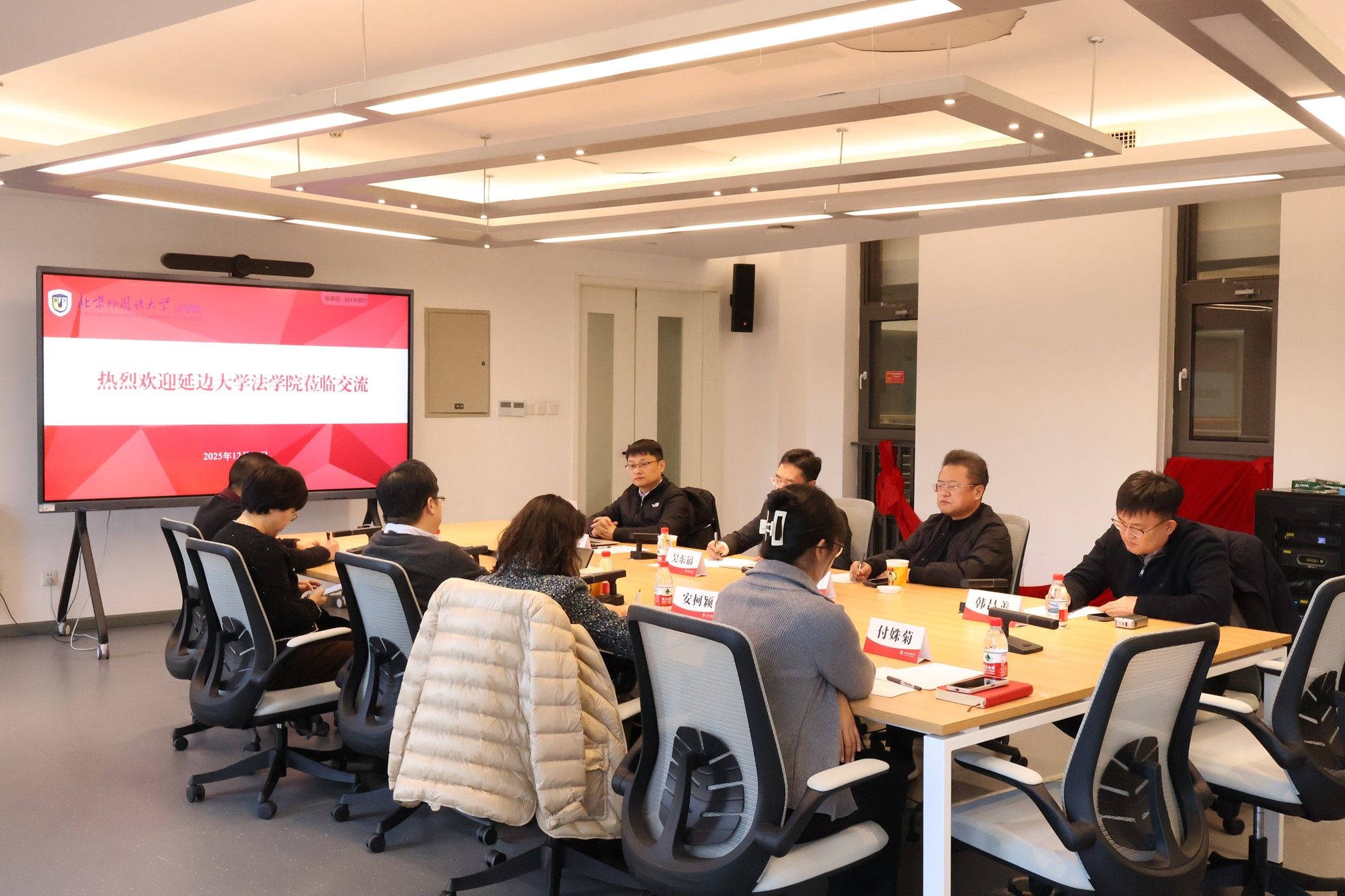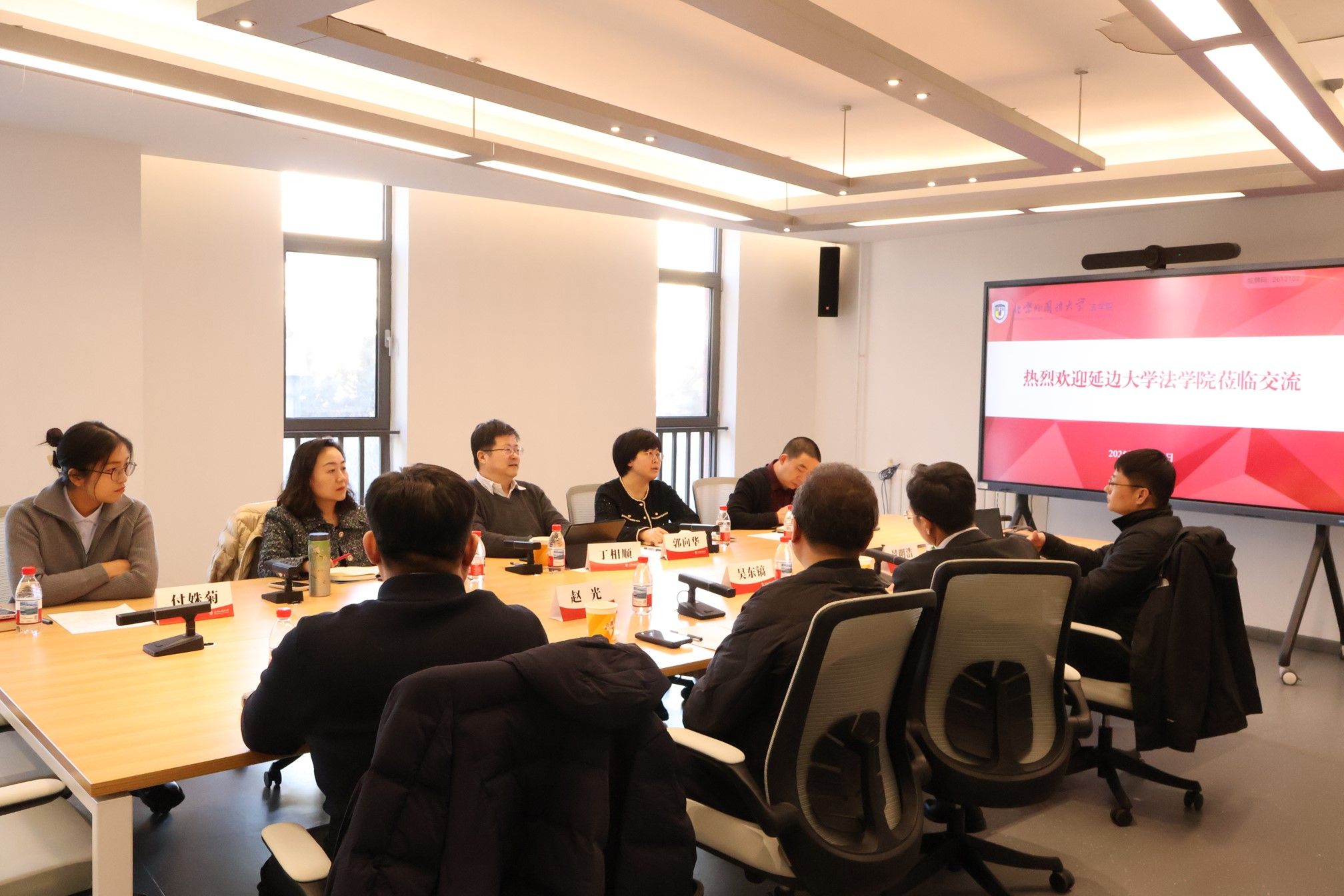 2025年12月30日下午,北京外国语大学法学院与延边大学法学院交流活动成功举办。北京外国语大学法学院党总支书记郭向华,院长丁相顺,教师代表安柯颖、姚琦、付姝菊,延边大学法学院院长吴东镐、党委副书记赵光、教学副院长景明浩、教师党支部书记韩昌善出席座谈。