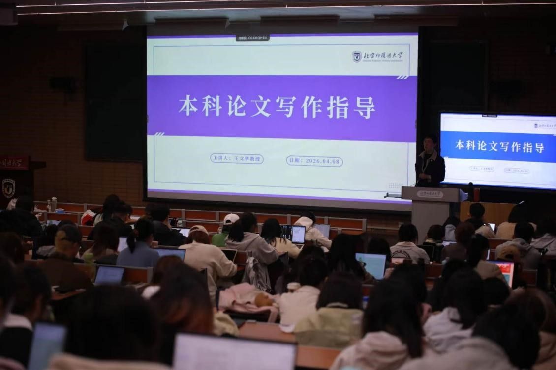 为帮助本科生解决毕业论文写作中的各类难题,提升论文撰写质量,助力同学们顺利完成学业,2026年4月8日,法学院成功举办“AI时代的北外法学本科学位论文写作”专题讲座。本次讲座特邀法学院王文华教授担任主讲人,法学院副院长万方教授主持讲座,2022级、2023级及其他年级本科生、部分研究生到场聆听学习。